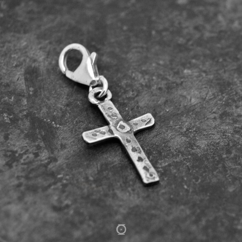 Llévate esta sencillita cruz en plata de ley y tranquilízate. No es apta para crucifixiones. El mosquetón la convierte en una pieza polivalente, que puedes colgar en pulsera, collar o pendientes.